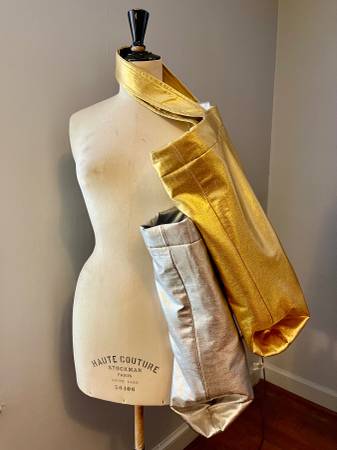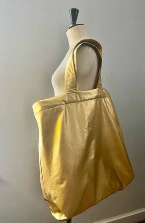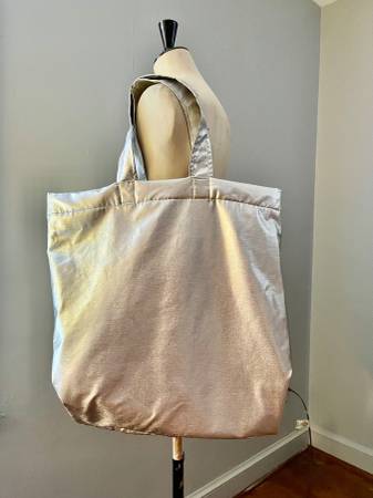 Metallic Denim Big Gold or Silver Tote is the best size for you! It features a crispy SILVER metallic finish and functions as a shopping bag, or a grocery bag or it's a Big Ass Purse. Hello!! 58%Cotton/40%Polyester/2%Spandex.Hand Wipe Clean. Made in the U.S.A.