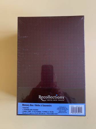Photo/Video Box. A heavy duty paper-coated cardboard storage box ideal for storing photos, greeting cards, keepsakes, trading cards, VHS tapes, and more! Holds up to 1100 4x6 inch photos or ten VHS tapes. Features a metal label plate and comes with durable tabbed file cards. This acid free box measures 4-1/2x7-3/4x11 inches. Available in a variety of designer prints: each chosen at random.