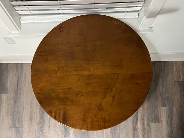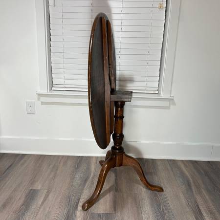 The circular top is raised on a single pedestal and supported on tripod legs. The table top conveniently tilts 90 degrees to the vertical position for ease of transport or storage. The table height is 26.5 inches and the table top diameter is 32.5 inches. This antique from New England has been in my family for several generations.