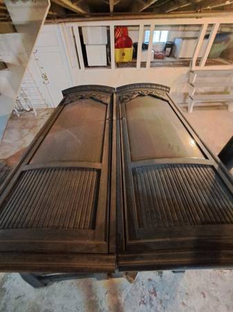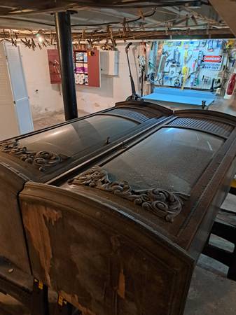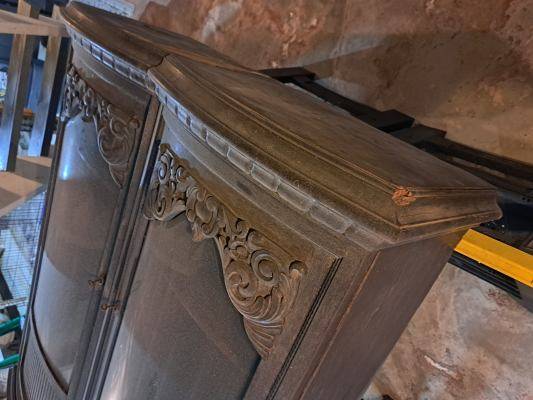 Hand carved doors, curved beveled glass windows, door keys, shelves all intact. Dating from the 1930s. Used to get financial assets out of Europe before WW2. Refugees invested in furniture and jewelry, since money could not be transferred out of some European countries. Has been in my family since 1930s. Needs some veneer work. Needs rectangular foundations recreated and veneered. Once beautiful, these cabinet can be made beautiful again with a little restoration and carpentry work.