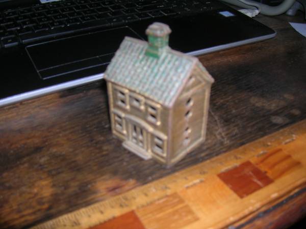 No iPhone or texting here. eMail only Antique Cast Iron Coin Bank Measures 2" x 1.5" x 3" tall Little house with a green roof. No iPhone or texting here. eMail only THANKS FOR LOOKING
