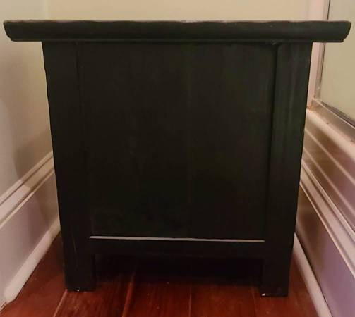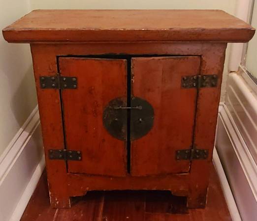 Beautiful red lacquer finish with original hardware. Black interior, back and shelf. Metal latch pin and hinges on the front. Certificate of antiquity. Made of fir and elm wood. 31w x 11d x 19h...