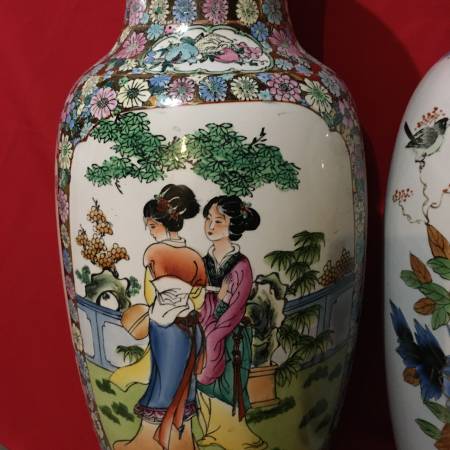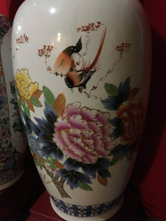 Pair of Chinese Famille Rose Porcelain Floor Vase, with wood stand 29.5" Tall, and 7.5" wide at bottom, with great condition, no chips or cracks. Both Vases for $390.