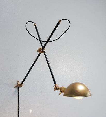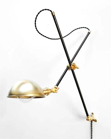 Design: Matte black powder-coated steel arms with brushed brass joints and parabolic shade