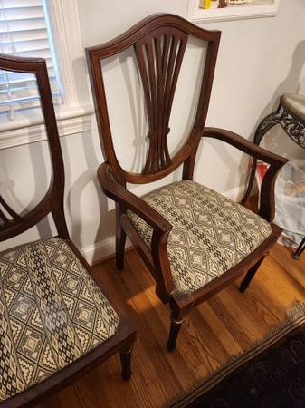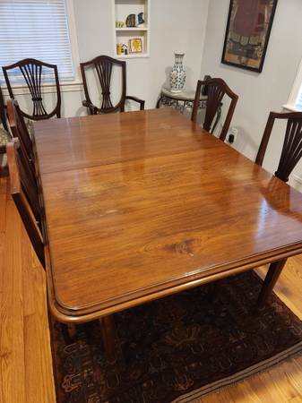 Antique Custom Built solid teak wood trestle dining table w/2 leaves, 2 armchairs, 6 dining chairs dimensions: dining table - 29" high X 45: wide X 65" long dining table leaf - adds 16" each or a...