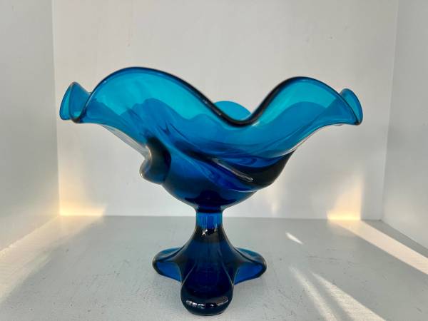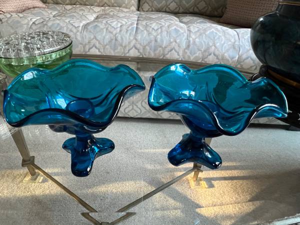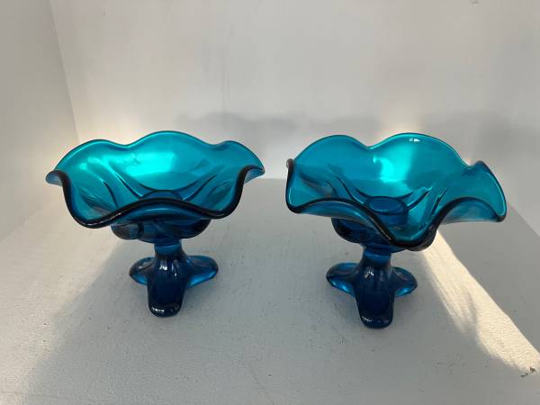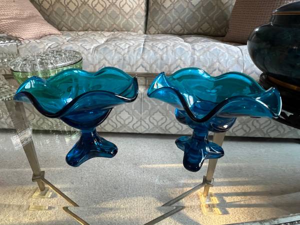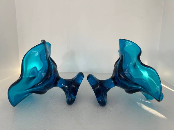 Stunning collectible set of candle holdlers MCM design from US glass maker Viking These are a 3 toed base from their Epic line in a beautiful blue color. In perfect condition I also have a matching...