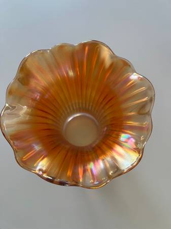 Vintage Northwood Marigold Carnival Glass Bouquet Vase- makers mark on base From the 1930’s. Gorgeous iridescent peach marigold vintage glass vase - a classic mid century piece in excellent...
