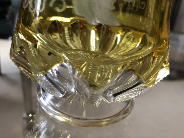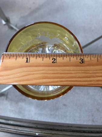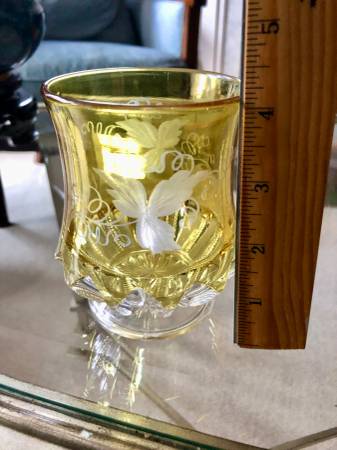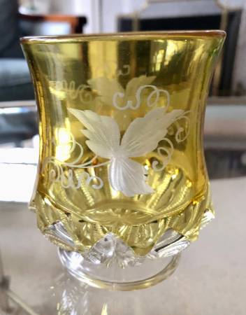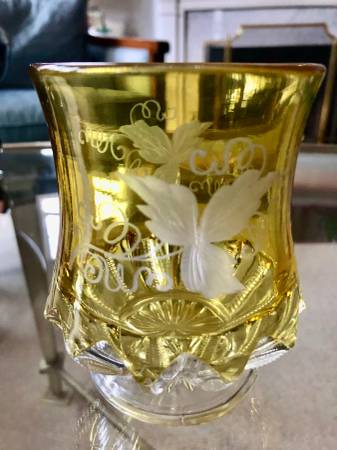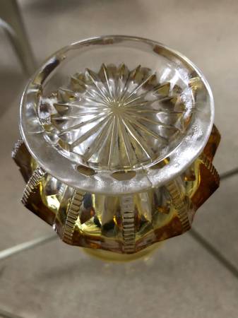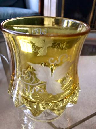 Vintage EAPG Duncan yellow or amber stain glass spooner or rose bowl vase, most likely early 1900s vintage. It's not marked or signed that I could find. It might also be used as an oversized drinking glass.