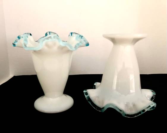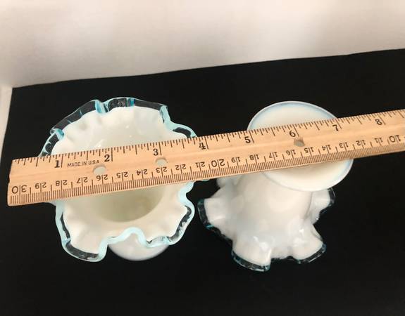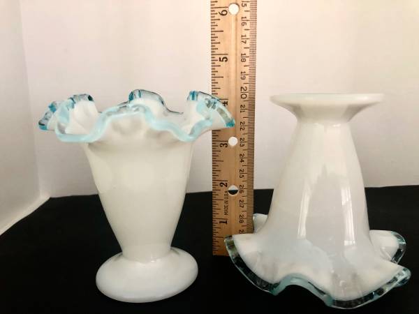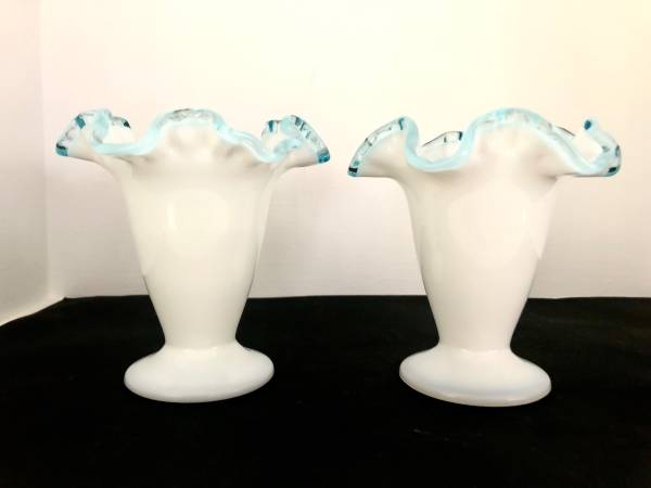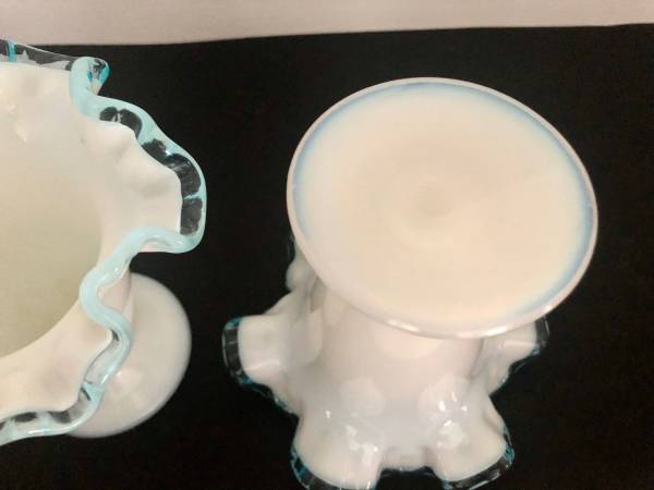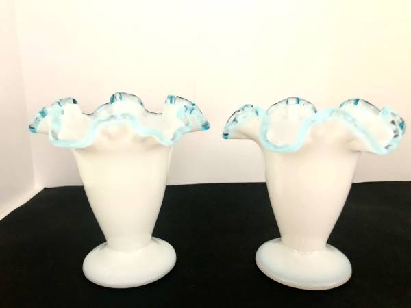 This pair of Vintage FENTON White Ruffled Short Vase with a Light Blue Trim are in Excellent Condition. Each vase is white with a light blue-turquise ribbon on the top ruffle. There are no Fenton markings on either vase which probably dates these to sometime between the 1940's and 1970s. Fenton is known for their darling ruffles and this set of vases are darling indeed!
