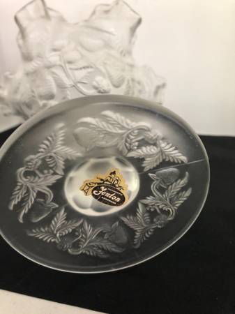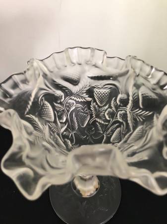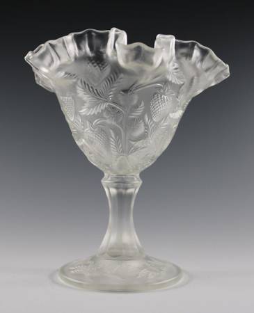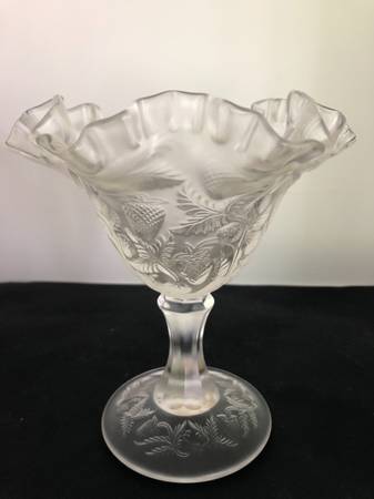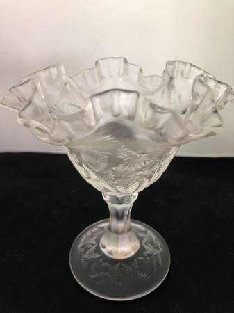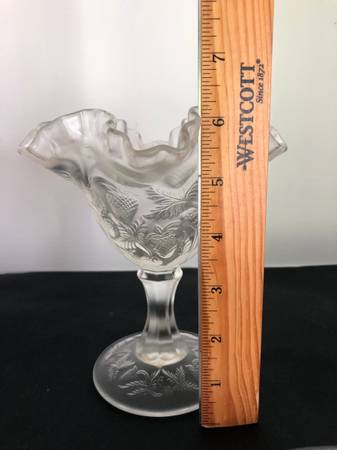 This is a vintage Fenton Art Glass handmade satin crystal velvet strawberry pedestal Compote. Produced in the 1990s. It measures 6 1/4" tall and 5 3/4" diameter. Not real proud of my pictures here, this compote is much more beautiful than my ability to take a picture of it. Nice strawberry vines, leaves and berries in this intricate pattern and velveteen glass texture. It all works together just gorgeously.