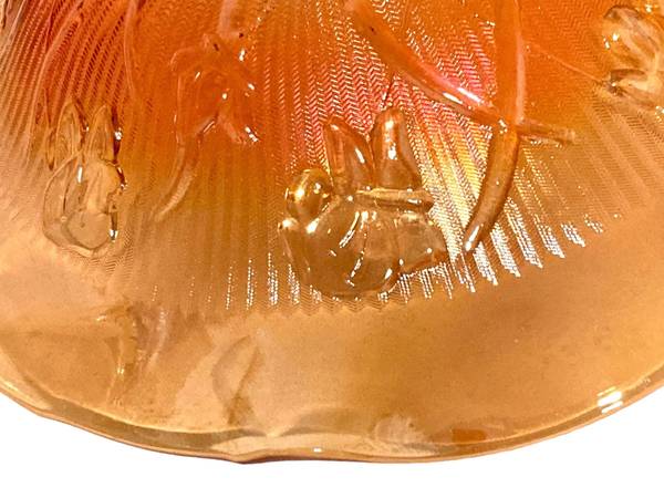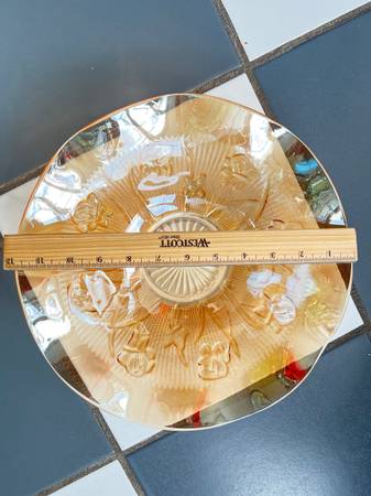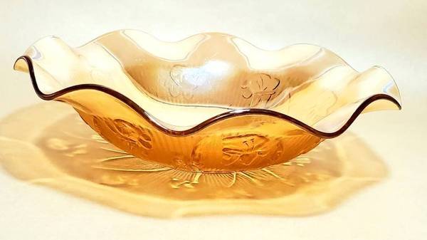 This is a vintage or antique collectible Marigold Carnival Glass Jeannette Louisa Iridescent Floragold Ruffled Rim Bowl. The dimensions of the bowl are approximately 9.75 inches in diameter with a...