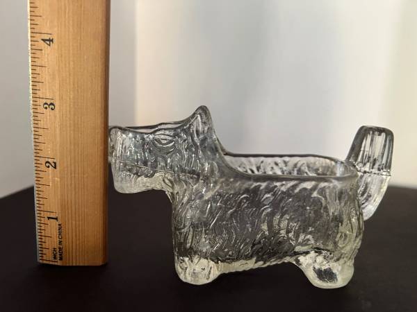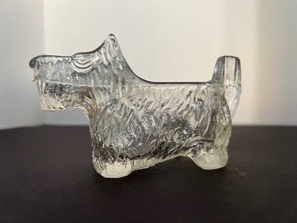 In excellent (looks perfect) condition. Super unique and charming. Vintage collectible. This adorable clear glass L E Smith scottie dog creamer was a Post Grape Nuts giveaway prize in the 1930's. Use this glass vessel as a creamer, a syrup pourer, a trinket dish, or small votive candle holder, etc. This piece has no numbers displayed on the base. Wonderful for any scottie dog lover!