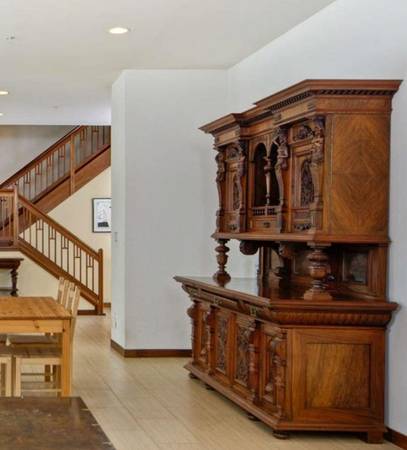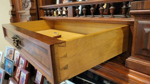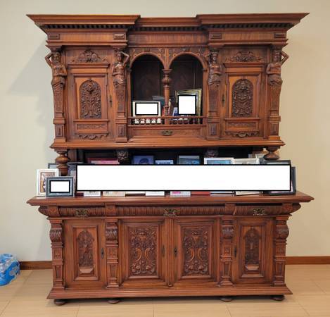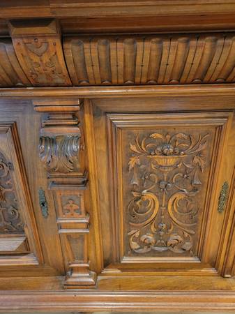 We're downsizing our large home: Absolutely stunning large German Gründerzeit Buffet (hutch), 1870s. Condition is very good (I think one very small trim piece is missing). We are selling it because we are downsizing from a large home to a townhome. It is in 3 parts (stacked one on the other). However, it still takes 4 men to move this. We bought it in Germany about 30 years ago and paid approx. $10,000 then. It came without a pediment (top decorative part). I have the sideboard for it (in acceptable condition, also without pediment). $3,999.
