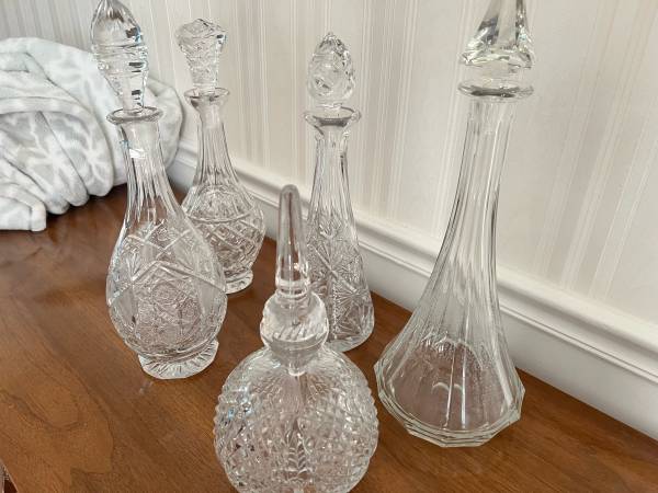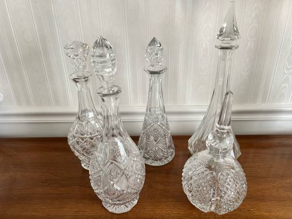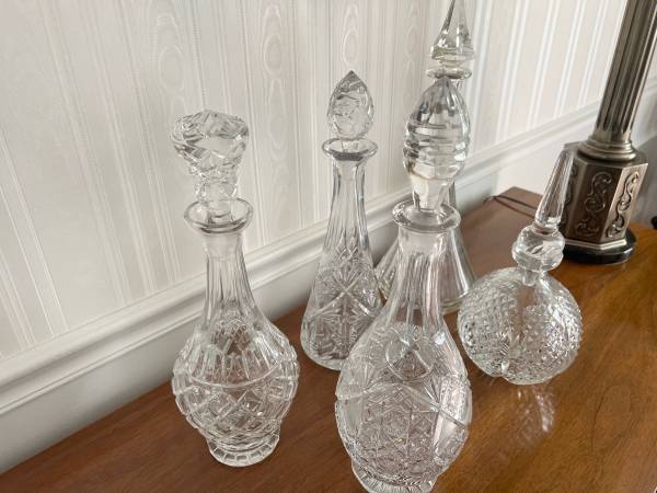 Assorted large crystal decanters. Three on left appear hand cut from Eastern Europe. Two on right of known quality or origin, thought the tall one is better quality. Sold only as a bundle.