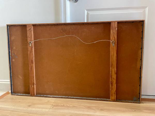 Sigbed and framed oil on wood painting measuring 28” x 49”.