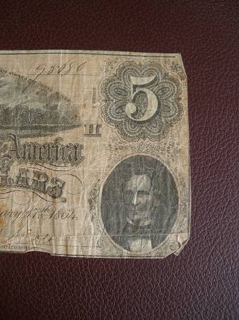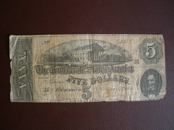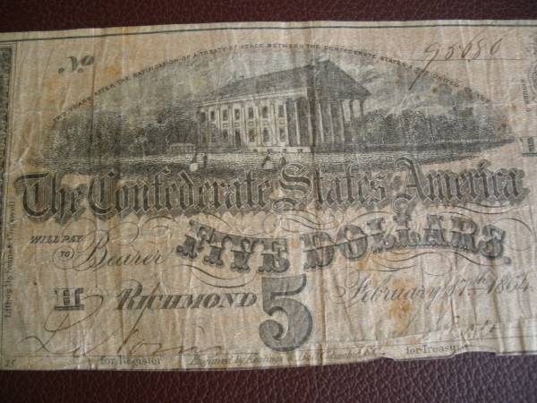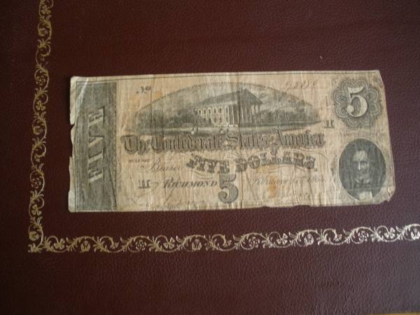 For sale is a rare 1864 CONFEDERATE STATES OF AMERICA $5 CURRENCY NOTE from Richmond, Virginia. This obsolete series G currency Confederate currency note was payable two years after the ratification of a peace treaty between the confederate states and the United States. The $5 note is individually signed and numbered 95080. The note was designed by Keatridge & Ball, Colombia, SC. The center of the note features an illustration of the Confederate Capitol at Richmond, Virginia and a portrait of Confederate Secretary of the Treasury C.G. Memminger. This note is of particular fascination for collectors, as an 1864 $5 Confederate Note was found in Lincoln’s wallet on the day he was assassinated. This note is in excellent condition. This note measures about 7 inches by 3 1/8 inches. A museum worthy historic collectible.