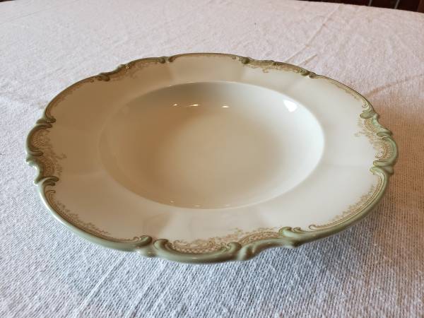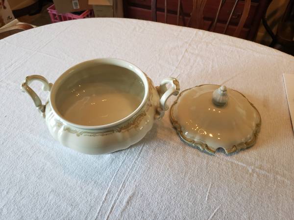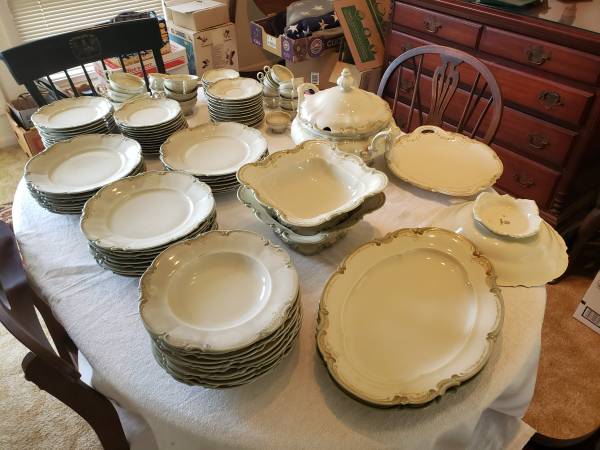 Complete flawless antique China set from Bavaria with dinner plates (24), medium side dishes (10), smaller side dishes, covered tureen, serving bowels (2), soup bowls (10), serving plate with handles, round serving bowl, coffee cups and saucers (10), demitasse cups and saucers (10)