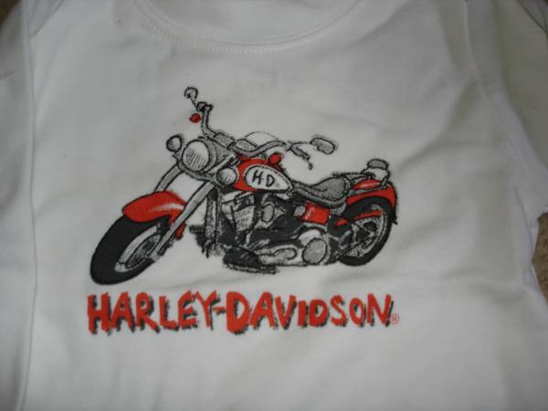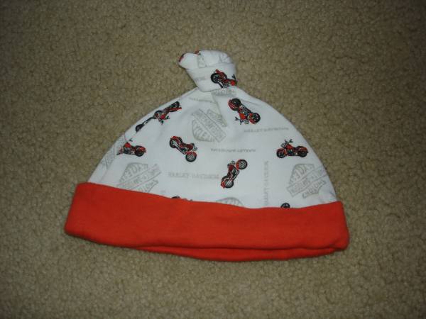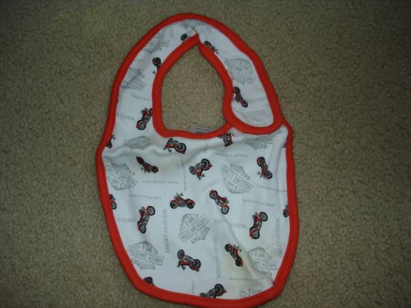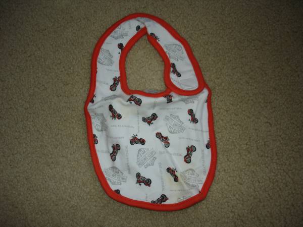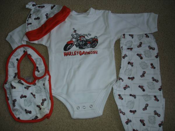 Genuine Harley Davidson branded onesie for a 3-6 month baby. The set contains 4 pieces. Onesie, pants, bib, and cap. 100% cotton.