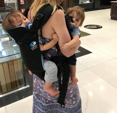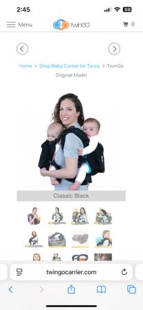 This is the original Twin Go. The first photos are from the website. The last is our actual Twin Go. This carrier was a life saver. You don’t have to have twins, but parent of two kids a year or so apart would also find this carrier useful. I ditched the stroller and took my kids everywhere with the Twin Go. We traveled a lot up through the 2 year lap kid for airfare. I used this in the airport, on the plane, and the rest of our travel. Can not say enough good things about this.