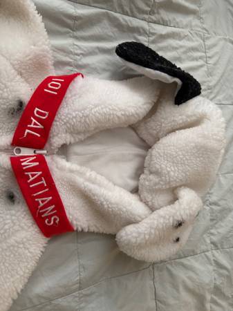 Soft white and black dot fleece kids Dalmatian costume from Disney Store. Perfect for staying warm this Halloween. Elastic ankle and wrist bands, front zip. Red collar. Vintage 90s. 101 Dalmatians...