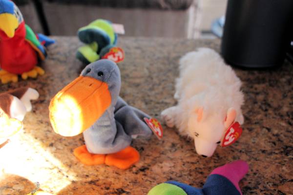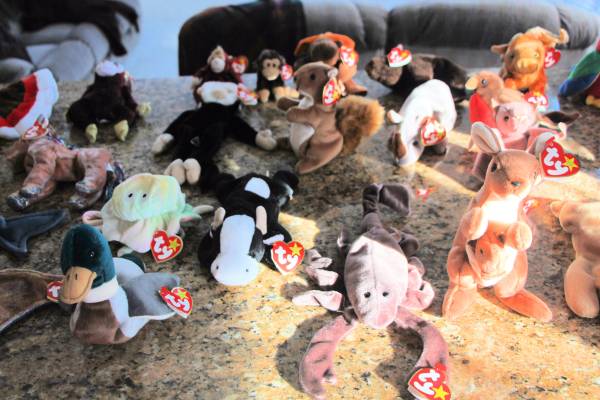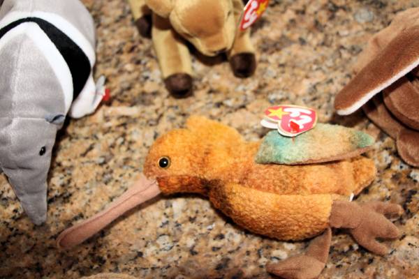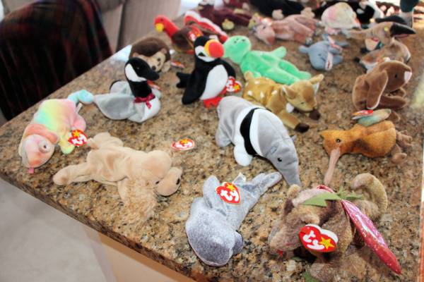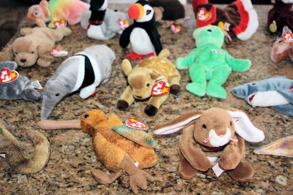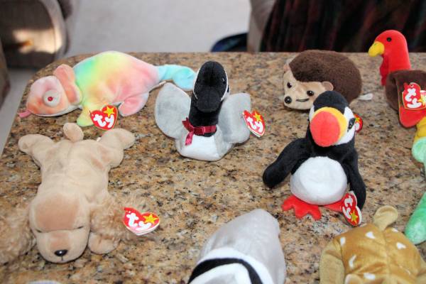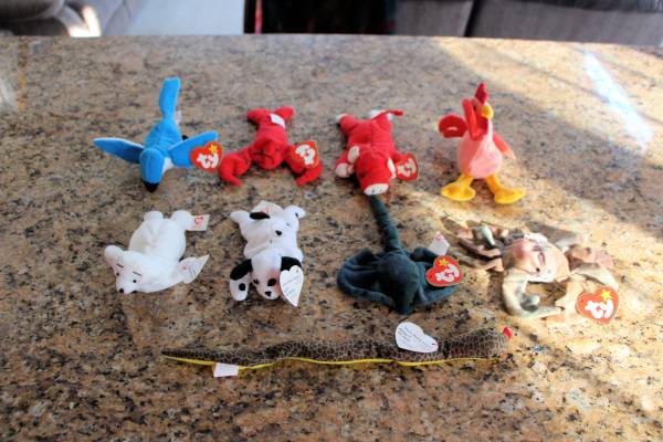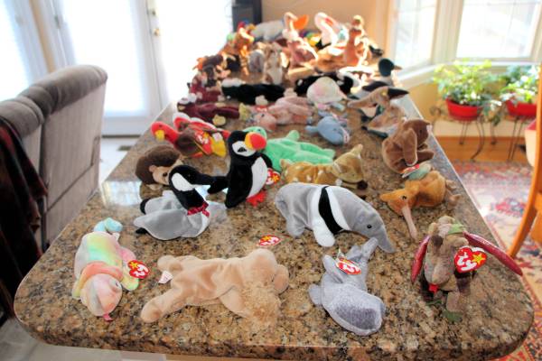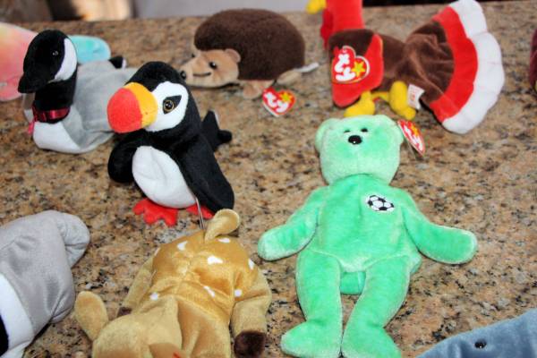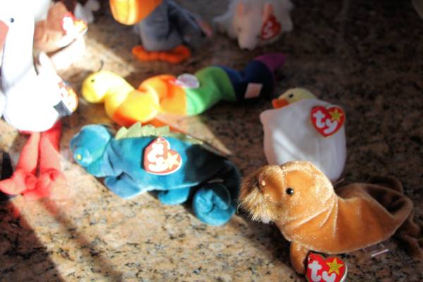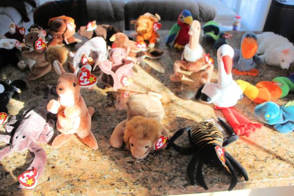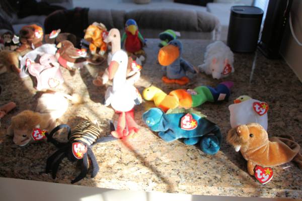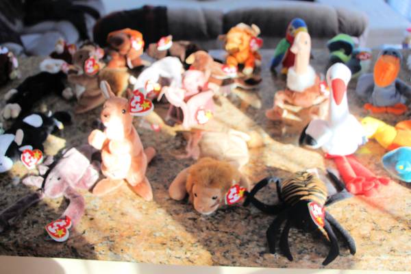 I have 38 Original Beanie Babies in a mint condition available for sale. I also have 9 Teenie Beanie Babies for sale. No deliveries, please pick up from home. Each of Beanie Babies or each Teenie Beanie Babies is for $8, or all 47 Beanie Babies for $225.