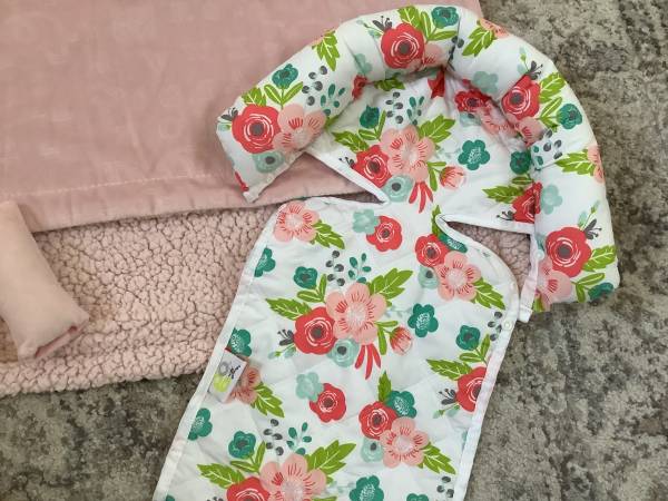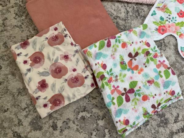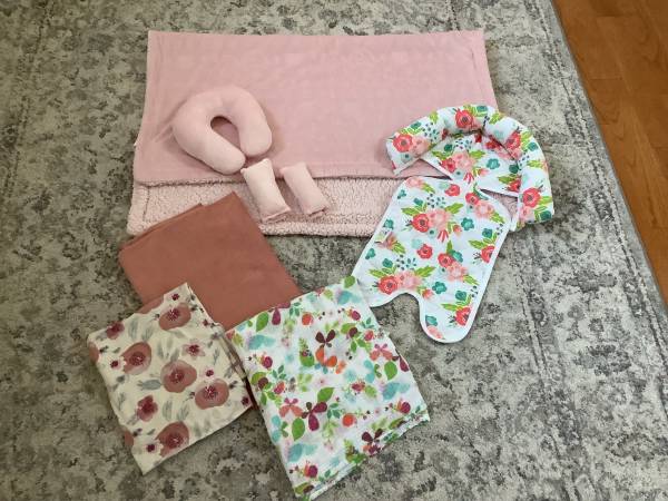 This is a collection of baby girl blankets including matching head and strap protectors and a head support insert. They are nice quality and in great condition. $10.00 for everything. $10.00 cash...