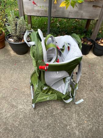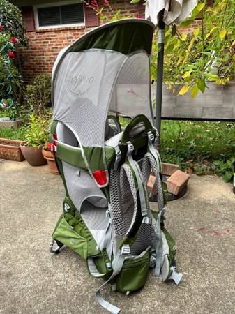 For sale Osprey child carrier backpack for carrying kids on hikes. Perfect for fall hiking and camping. It has also has a convertible sun shade. My son would fall asleep and take naps in this while hiking. We bought this for a lot of money from REI but you can save a lot buying this one used in good condition.