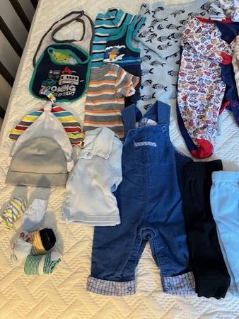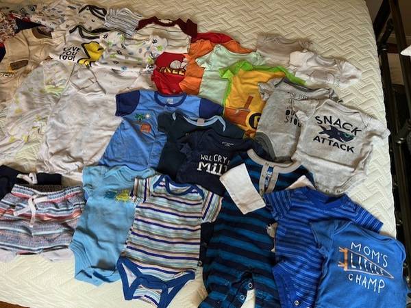 Everything you need for your little bundle of joy. 40+ pieces of clothes and accessories in assorted colors. Includes footies, pajamas, long and short-sleeved onesies, bibs, socks, and hats. Less than $1 / item. Clothes are used and show normal wear and tear. Good quality, no rips, tears, or damage. From our little one to yours, we hope you and your family enjoy these as much as we did.