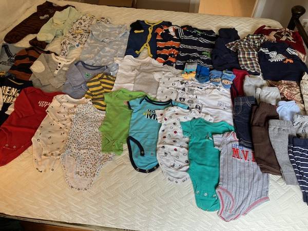 Everything you need for your little bundle of joy. 45+ pieces of clothes and accessories in assorted colors. Includes footies, pajamas, long and short-sleeved onesies, socks, hats, bibs, and a laundry/diaper holder. Less than $1 / item. Clothes are used and show normal wear and tear. Good quality, no rips, tears, or damage. From our little one to yours, we hope you and your family enjoy these as much as we did.