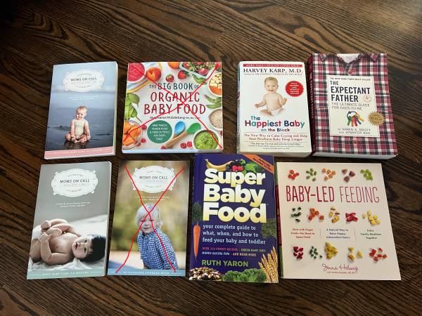 Various baby, kids, and parenting books. Great for parents with newborns. All in fantastic (mostly unread) condition. The ones in the photo are included. Any with a red "X" over them are sold. The...