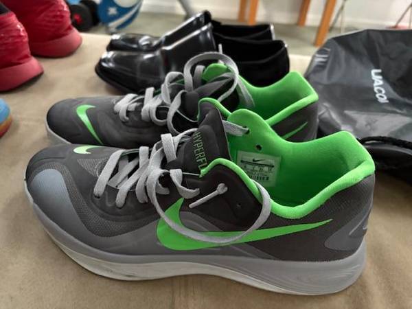 3 pairs of Nike sneakers blue/orange/black - size 10.5 red/white - size 10 grey/green - size 10 1 pair of black dress shoes - size 9.4 M $3 each or $10 for all.