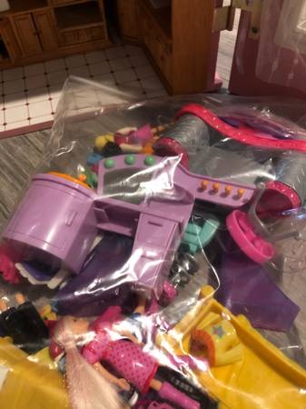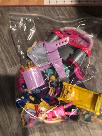 A full bag of Polly pocket dolls. Includes lots of Polly pocket people, furniture, clothes, all in excellent condition.