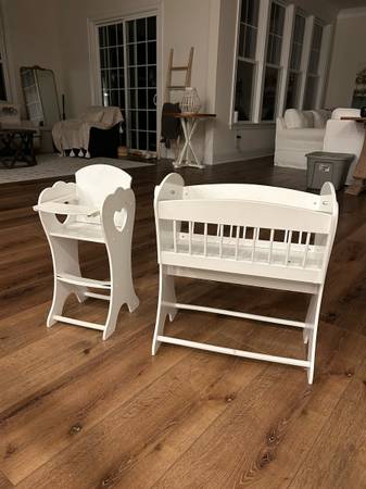 Adorable high chair and rocking cradle selling as a set for $35. 18” doll fits very well in either piece. Endless hours of play for your little one with this set! Pet-free and smoke-free home. Cash...