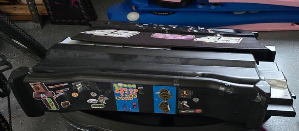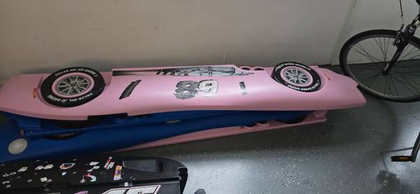 kids car bed in pink and blue. some of the stickers came out but it is good.
