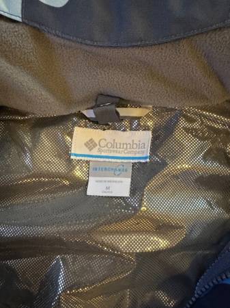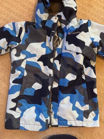 Gently used boys Columbia winter coat system. It's a blue camo pattern with a solid navy fleece that can be zipped inside for a very warm jacket, or worn separately. The outer shell is waterproof and comes with the reflective Omni heat by Columbia. It's a youth size medium.