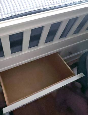 Solid wood, cottage white captain's bed with three big built-in storage drawers ( 21" x 15" x 7" interior size) and a full-size trundle (pull-out bed underneath).