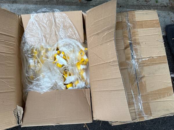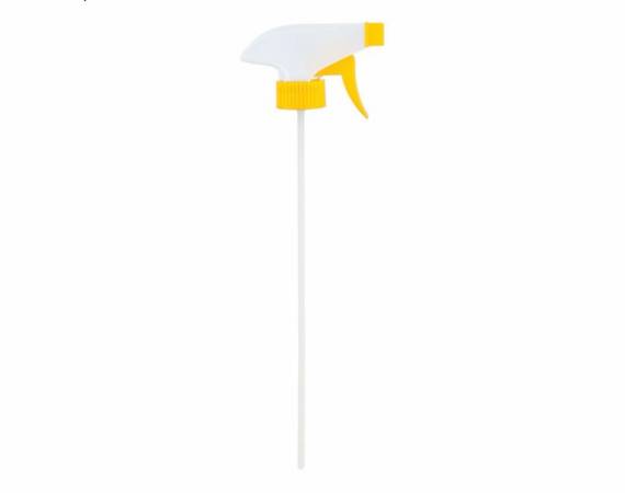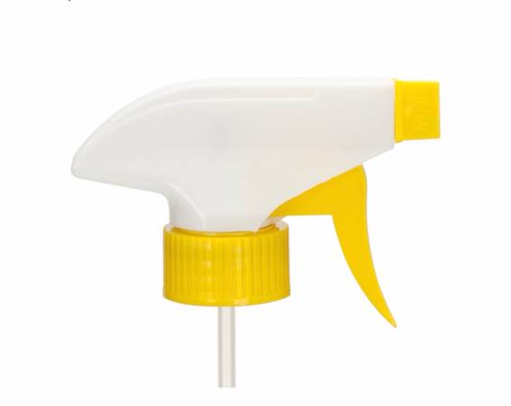 A 28mm (28-400 neck finish) white and yellow general use trigger sprayer with 9-1/4" dip tube. The nozzle is adjustable to create a fine spray or jet stream for dispensing liquids. About 900 sprayers.