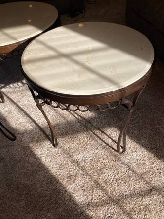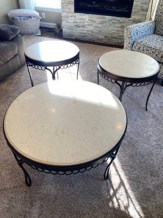 Granite Coffee & End Tables. 3 pieces Belfort Granite Coffee & End Tables Coffee Table: 38”-diameter, 21” tall 1ea End Tables: 26” diameter, 24” tall 2ea