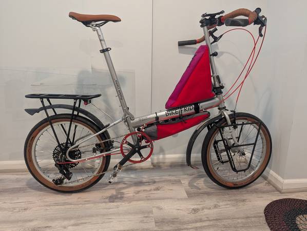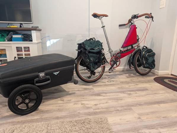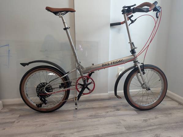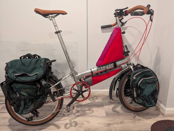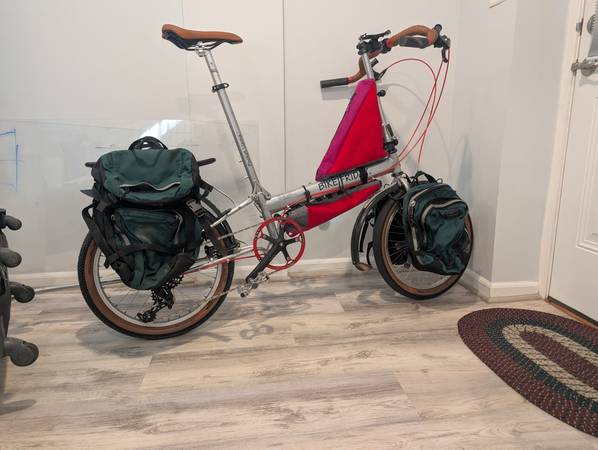 Bike Friday Pocket Llama. 60cm frame ETT. Great for a 6'0" 6'5" rider. Good for a rider up to 230lbs, and can carry 100lbs extra on the front and rear racks. Ready for your next one-way tour or cross country ride. This bike has a new powder-coat metallic paint finish. New Schwalbe One tires. Also included are packable front and rear pannier racks, Overland front and rear panniers, and custom frame bags. This bicycle comes with the Bike Friday Trailer and packing kit. The bike packs away into the trailer for travel without extra luggage fees. Upgraded White Industries headset, bottom bracket, and SRAM NX 1x11 drive train. Bullhorn handlebars.