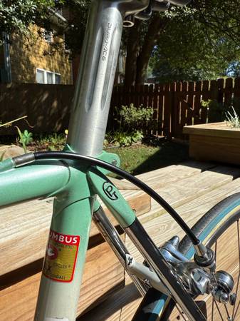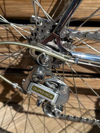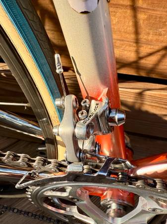 Original Spumoni paint scheme shows signs of wear. Decals have mostly disintegrated, typical for this era. Frame and chrome are in very good condition. New brake pads, cables and bar tape. Bike is tuned, lubed, cleaned and ready to ride!