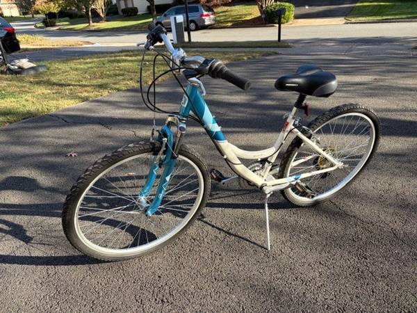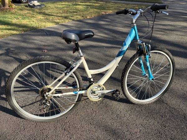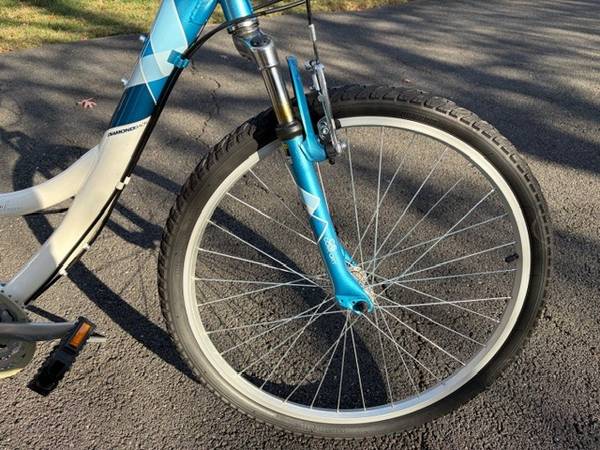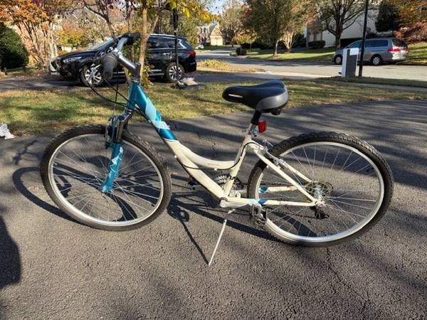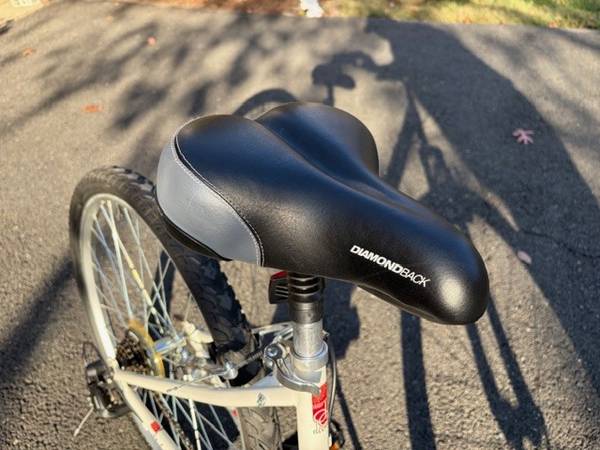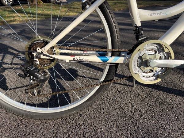 Ladies 26" Diamondback Serene Citi Classic bike in white and blue. Bike has been stored since new in climate-controlled storage unit. Like new condition with no visible wear anywhere other than very light, barely noticeable marks on frame. Owner had medical issue after buying the bike and never used it. Very nice and comfortable with suspension on front fork and saddle. Shimano Tourney TX derailleur. Quick-release hubs. Price includes OnGuard cable lock (don't know combination - cable is in unlocked position). Located in Herndon, VA - come take it for a spin. Cash only please and all sales final. Thanks for looking!