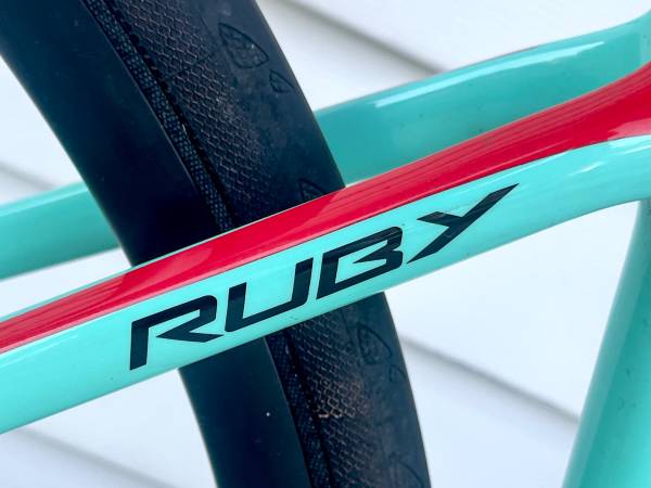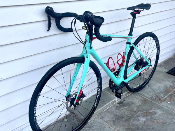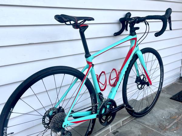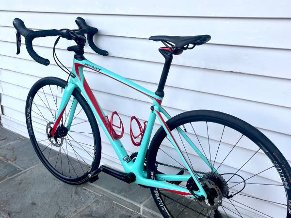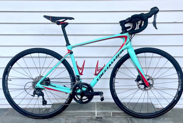 Excellent condition, medium (54 cm) Specialized Ruby Comp full carbon fiber road bike with high end components. Recently serviced and cleaned, and in great mechanical and cosmetic condition. Aqua blue green paint with red highlights.