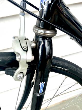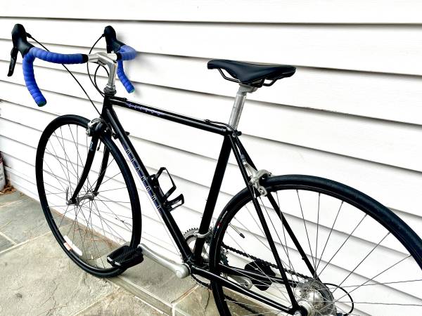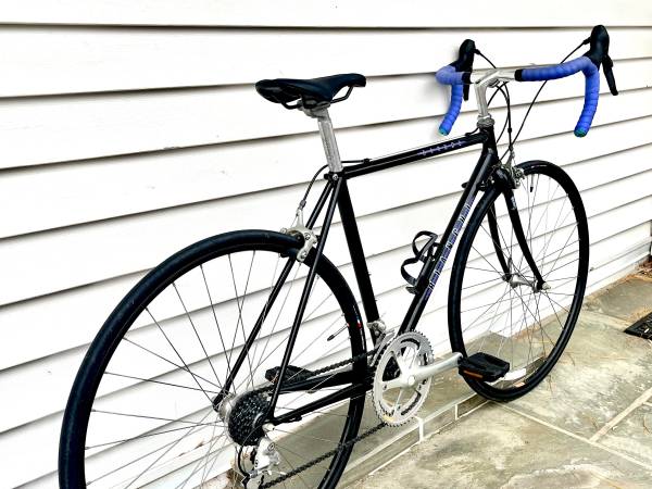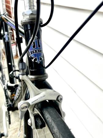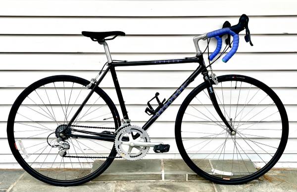 Pristine condition Bianchi Alfana vintage lugged steel frame Italian road bike with upgraded Shimano 105 drivetrain and MicroSHIFT R7 brifters. New brake pads, cables, bar tape, and Trek Verse Comp road saddle. Mechanic owned and maintained and in excellent condition. Recently tuned. Black paint with lavender highlights.