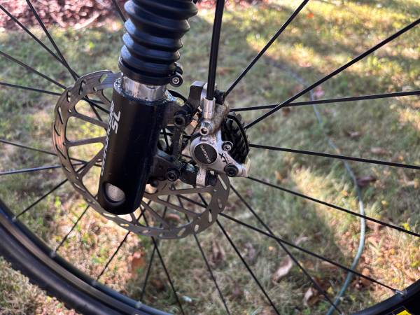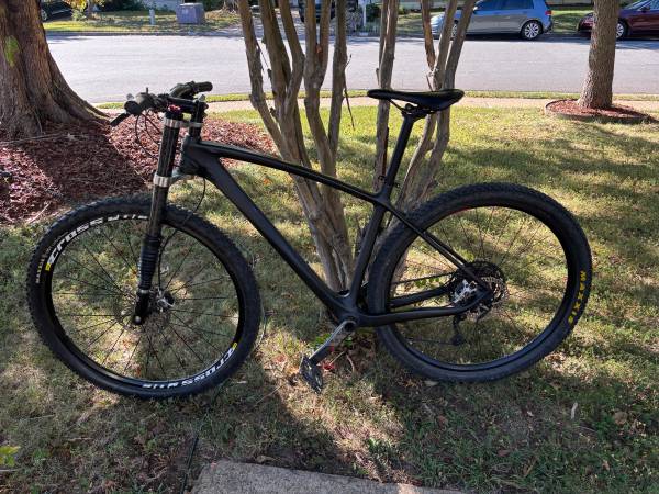 Custom MTB with carbon fiber frame, Cannondale Lefty fork, and Shimano high quality parts to include derailleur, drivetrain, and hydraulic brakes.