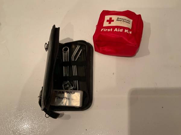 Includes pressurized tire filler, tool kit, first aid kit, helmet, spare tube, twin LED lights, with kit carrier and kit, bell.