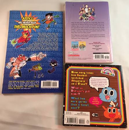 3 graphic kids books, "Teen Titans Go! Party, Party!" , "Who'd Have Thunk It?" from the Amazing World of Gumball, and "The Babysitters Club Mary Anne Saves the Day" From a smoke and pet free home.