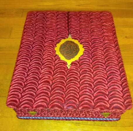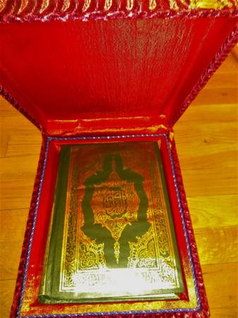 Qur’an with gold-embossed covers (printed in Cairo, 1981) contained in large wooden velvet-lined case. Made in Egypt, early 1980s. Unused.