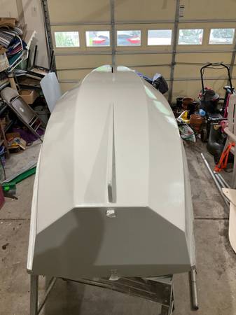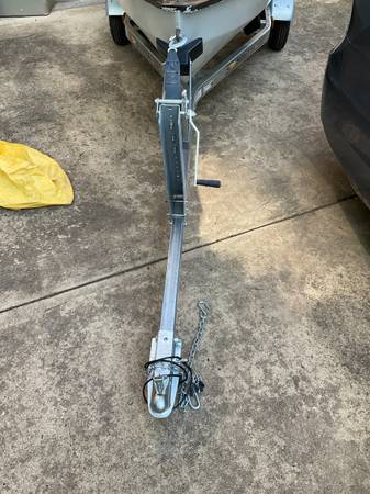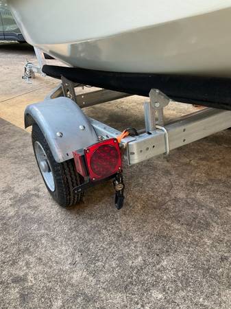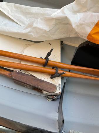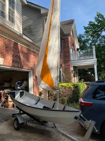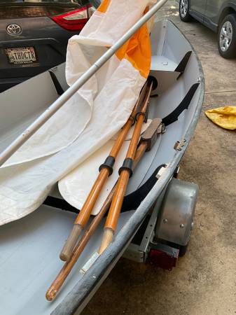 Wooden boat in good condition. Two-person capacity. Sails in good condition, with one or two mast rings broken (sail still hoistable/operable). Nice wooden oars with oarlocks. Brand new trailer (barely used); trailer lights work. Comes with a false floor so you can sit in the bottom of the boat and sail without getting too wet.