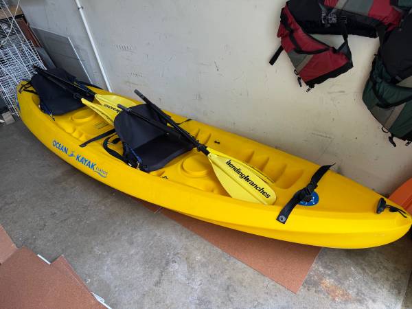 12’ Malibu Two Ocean Kayak Classic sit-on-top + 2 Crazy Creek adjustable seats + 2 Bending Branches Infusion paddles. Gently used, always garaged and all in almost perfect condition. Ready to hit...