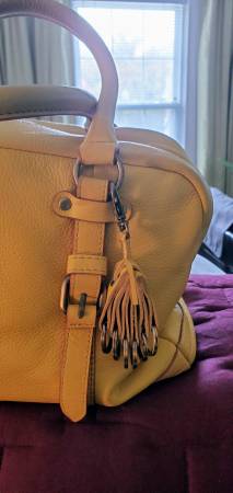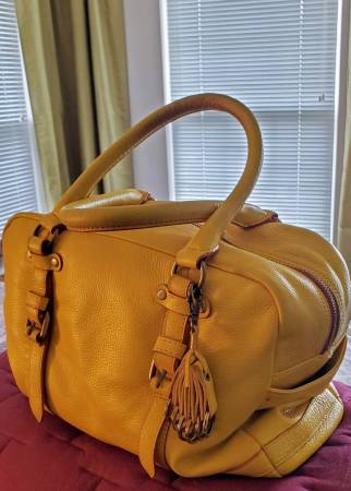 Anthropologie leather handbag in a bright yellow. Great condition lots of detail...inside and outside pockets. Bought on sale for 290.00..originally 440.00